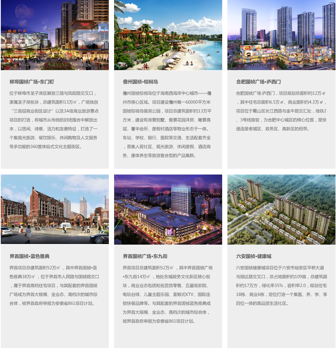 公司秉承“产业����� �������Ƴ����������� �������Ƴ������������ �������Ƴ������������ �������Ƴ�������报国 奉献社会”的品牌宗旨,坚持“诚信 勤俭 ����� �������Ƴ����������� �������Ƴ������������ �������Ƴ������������ �������Ƴ�������竞争 创新”的企业精神,����� �������Ƴ������������ �������Ƴ������������ �������Ƴ����������� �������Ƴ�������将低碳、绿色、健康的生活方式完整地贯穿到����� �������Ƴ������������ �������Ƴ������������ �������Ƴ������������ �������Ƴ�������房地产的规划、开发、运营和服务的整个流程之中。����� �������Ƴ������������ �������Ƴ������������ �������Ƴ������������ �������Ƴ�������公司立足合肥、深耕安徽、辐射����� �������Ƴ������������ �������Ƴ����������� �������Ƴ������������ �������Ƴ������周边,先后投资开发了海口“八达大厦”、合肥“金湖����� �������Ƴ������������ �������Ƴ����������� �������Ƴ������������ �������Ƴ�������新村”、阜阳“蓝色雅典”、“国祯家园����� �������Ƴ����������� �������Ƴ����������� �������Ƴ������������ �������Ƴ�������”、界首“国祯广场”、蚌埠“国祯广场����� �������Ƴ����������� �������Ƴ������������ �������Ƴ������������ �������Ƴ�������”、合肥“国祯广场”等高端住宅、城市综����� �������Ƴ������������ �������Ƴ������������ �������Ƴ����������� �������Ƴ�������合体项目,累计开发建筑面积超200万平����� �������Ƴ������������ �������Ƴ������������ �������Ƴ������������ �������Ƴ�������方米,所开发项目均成为地����� �������Ƴ������������ �������Ƴ����������� �������Ƴ����������� �������Ƴ�������标性社区和区域带动性项目。