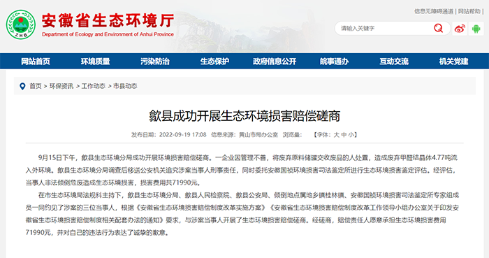 9月15日下午,歙县生态环境分局成功开展环境损害����� �������Ƴ����������� �������Ƴ������������ �������Ƴ������������ �������Ƴ������赔偿磋商。一企业因管理不善,将废弃原料储����� �������Ƴ������������ �������Ƴ������������ �������Ƴ������������ �������Ƴ�������罐交收废品的人处置,造成废弃甲醛结晶体4����� �������Ƴ����������� �������Ƴ������������ �������Ƴ������������ �������Ƴ�������.77吨流入外环境。歙县生态环境分局调查后移送����� �������Ƴ������������ �������Ƴ������������ �������Ƴ������������ �������Ƴ�������公安机关追����� �������Ƴ������ �������Ƴ������������ �������Ƴ������������ �������Ƴ������������ �������Ƴ�������������究涉案当事人刑事责����� �������Ƴ������������ �������Ƴ������������ �������Ƴ����������� �������Ƴ�������任,同时委托安徽国祯环境损����� �������Ƴ������������ �������Ƴ����������� �������Ƴ������������ �������Ƴ������害司法鉴定所进行生态环境损����� �������Ƴ������������ �������Ƴ������������ �������Ƴ������������ �������Ƴ�������害鉴定评估。经评估,当事人非法倾倒危废造成生态环����� �������Ƴ������������ �������Ƴ������������ �������Ƴ������������ �������Ƴ�������境损害,损害费用共71990元。